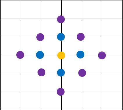 图形中有多个不同的图案,同一个图案的定义是这样的,对于两个发光的点,如果他们的曼哈顿距离(对于A(x1,y1)和B(x2,y2),A和B之间的曼哈顿距离为|x1-x2|+|y1-y2|)小于等于2,那么这两个点就属于一个图案。
