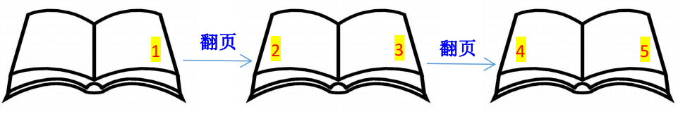 一开始书本状态为第 2 张图。可以看到,第 1 页在右,第 4 页在左。