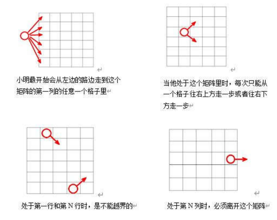 小明最开始会从左边的路边走到这个矩阵的第一列的任意一个格子里