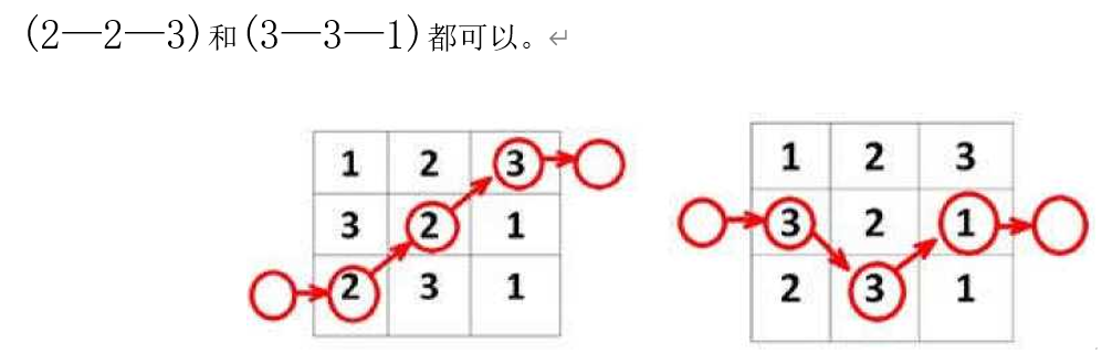 当他处于这个矩阵里时,每次只能从一个格子往右上方走一步或者往右下方走一步;